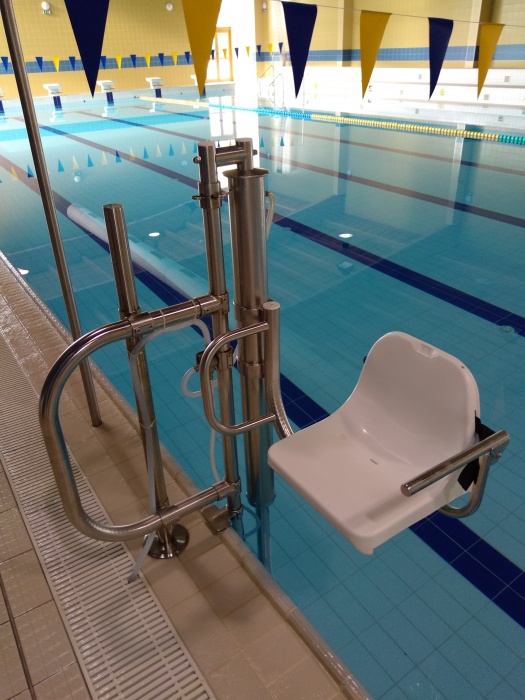 Po vyřešení několika technických problémů se podařilo k vnitřnímu 25m bazénu na hale umístit bazénový zvedák Delfín.